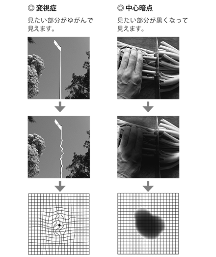 治療のために早期発見が重要!片眼ずつ、視力検査を行う、視野中心部のゆがみや黒いシミ