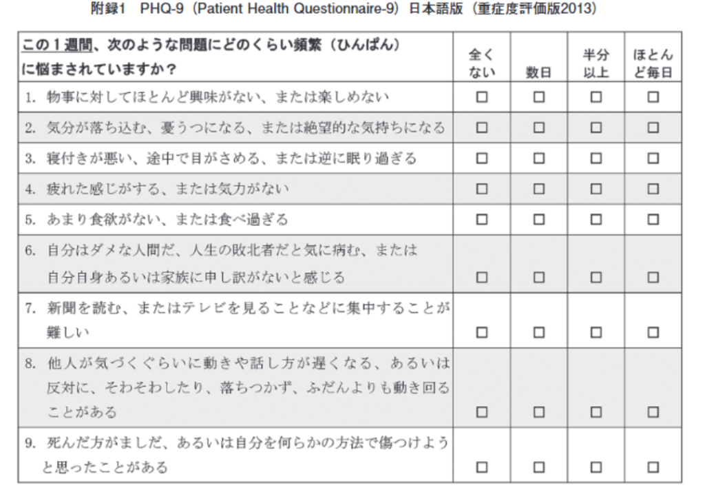 PHQ-9 は,DSM 診断基準の評価項目が含まれた 9 項目の質問である.PHQ-9 のスコア範囲は 0~27 点であり,10 点以上はうつ病の可能性を示唆している.症状評価は、「全くない=0点」「数日=1点」「半分以上=2点」「ほとんど毎日=3点」として総得点(0〜27点)を算出する。