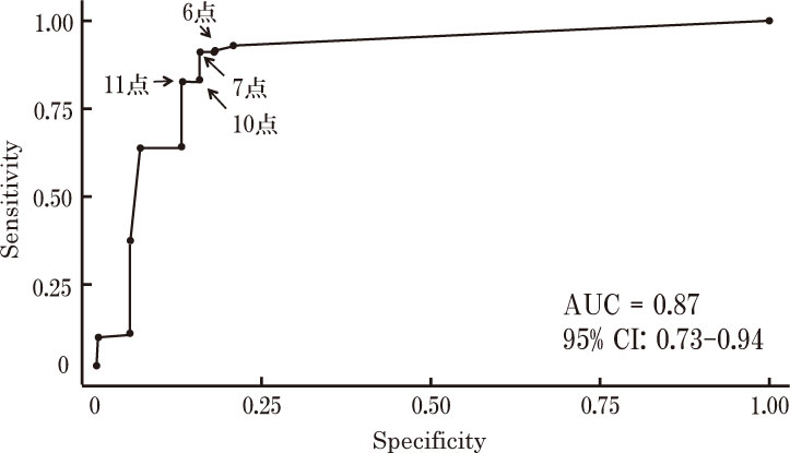 カットオフポイントが 3 以上の場合は 0.72(0.67-0.77)と 0.85(0.83-0.87)