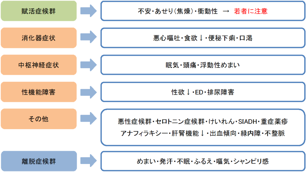 • 不眠や眠気といった睡眠や、性機能障害がおこることもある