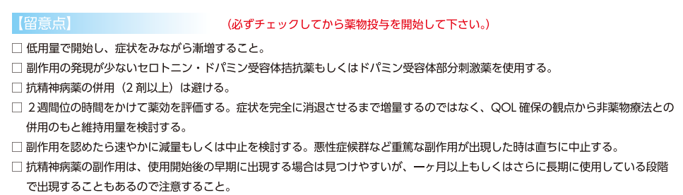 • 2011年 9月に厚生労働省から,Quetiapine・Haloperidol・Perospirone・Risperidone について,「器質性疾患に伴うせん妄・精神運動興奮状態・易怒性」に対しては適応外使用認めるとの通知が出ている