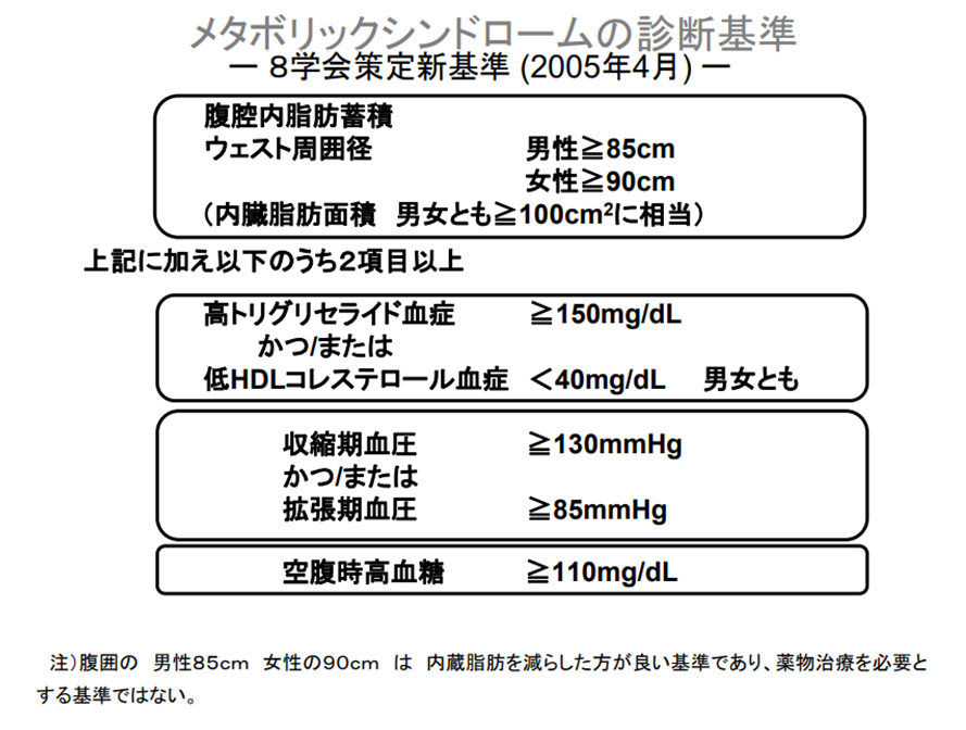 - 日本でのメタボリックシンドロームは「内臓脂肪蓄積を基盤とした心血管リスクの集積」