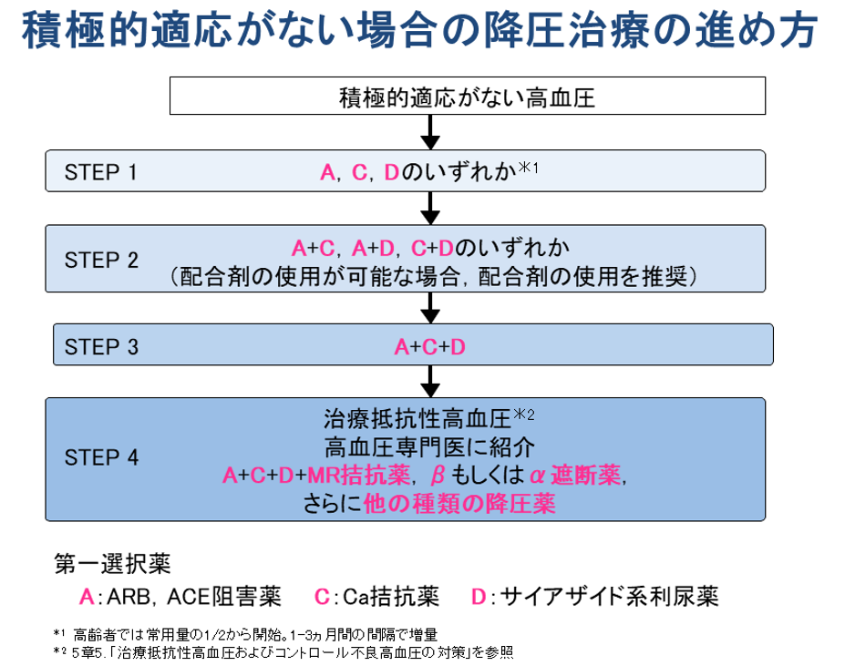 - A+C+Dの3剤併用療法でも降圧が得られない→治療抵抗性高血圧→βBやαB、MRAを追加する