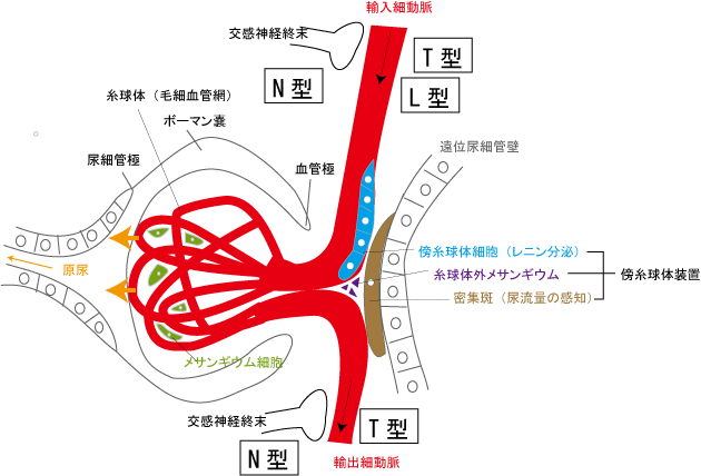 高血圧→腎糸球体保護のため輸入細動脈の収縮→腎血流低下→RAA系のさらなる亢進→血圧上昇→・・・という負のループが続くと、最終的には代償機構が破綻して糸球体内圧が上昇→糸球体硬化→タンパク尿の出現