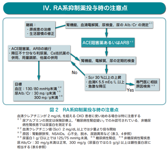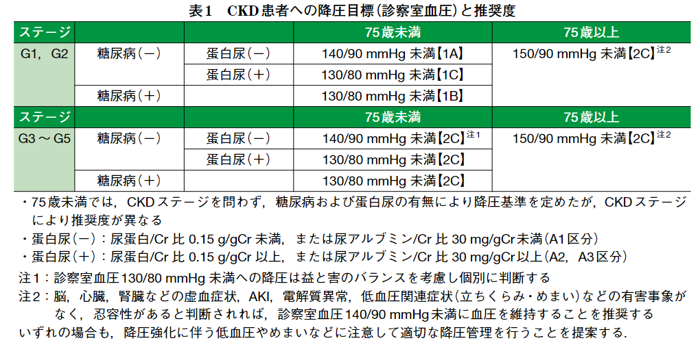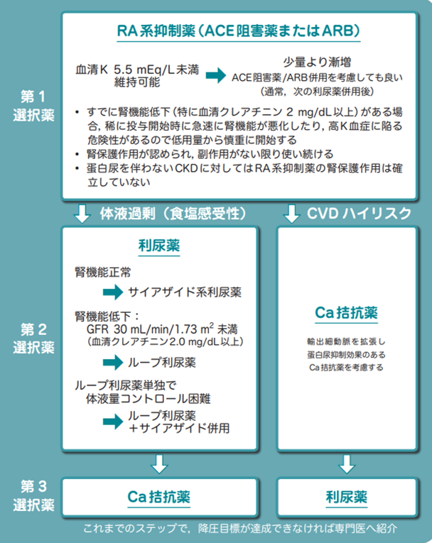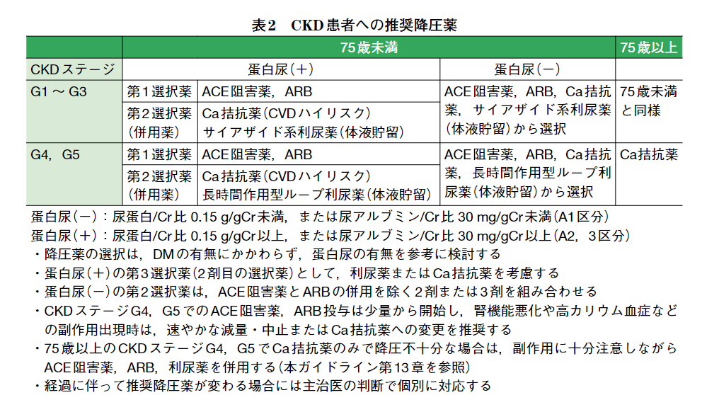 尿蛋白陽性のCKD合併高血圧ではACEI/ARBが第一選択(降圧目標:診察室血圧130/80 家庭血圧125/75)