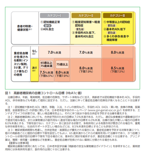 高齢者糖尿病→認知機能やADL、合併症に基づいてカテゴリーごとの治療目標がある(高齢者糖尿病治療ガイド2021:日本糖尿病学会・日本老年医学会)→カテゴリー3ではHbA1c8.0~8.5未満が管理目標とゆるく設定されている