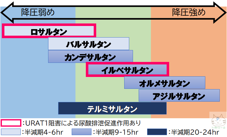 - ロサルタン,イルベサルタンに特有の作用として,尿酸トランスポーターであるURAT1を阻害し,腎からの尿酸排泄を促進する作用がある(尿酸値を上昇させる利尿薬やβ遮断薬との併用が◎)